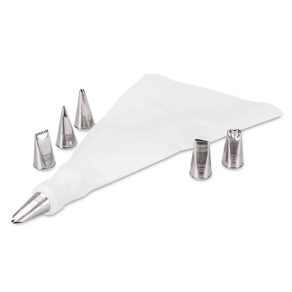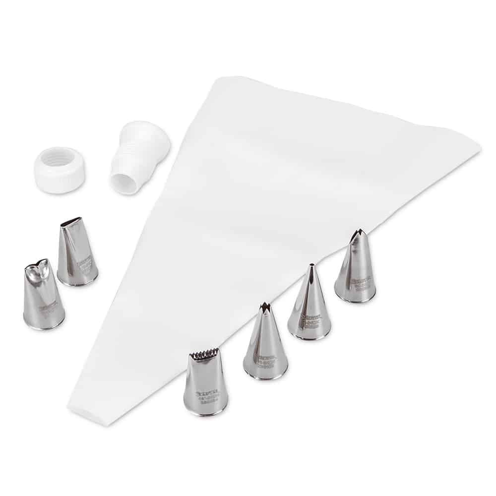 Komplekti kuulub 6 roostevabast terasest standardsuuruses otsakut (ümmargune nr.2, leht nr. 68, kroonleht nr.103, satsid nr. 100, korvi punumiseks nr. 48 ja avatud täht nr. 16), adapter nende kasutamiseks ja korduvkasutatav pritskott (25 cm). Otsakute abil saad valmistada lehti, lilli, korvi- ja muid mustreid.