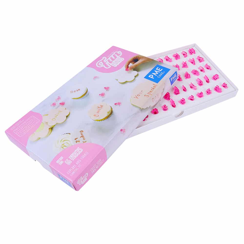 Komplekt koosneb muffinite ja küpsiste kaunistamiseks sobiva suurusega tähtedest, numbritest ja sümbolitest. Kokku 66 templit kõikvõimalike sõnumite koostamiseks: 26 kirjatähte, 26 trükitähte, numbrid 0-9 ning sümbolid &, !, ? ja #. Templid pressitakse suhkrumassi või martsipani ning soovi korral värvitakse üle.