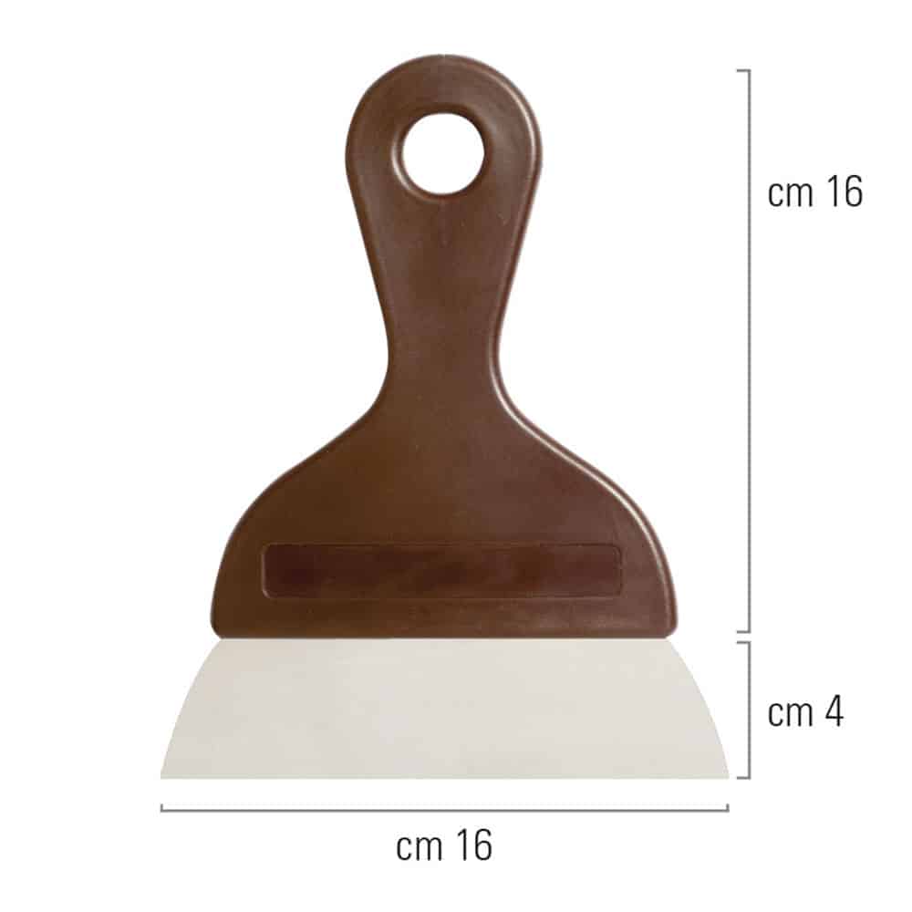 Ergonoomilise plastist käepideme ja roostevabast terasest teraga mitmeotstarbeline spaatel, mis sobib suurepäraselt lõikamiseks, hakkimiseks, kraapimiseks, silumiseks ja koostisosade tööpinnalt kogumiseks. Ideaalne šokolaadi töötlemiseks. Tera laius 16 cm.