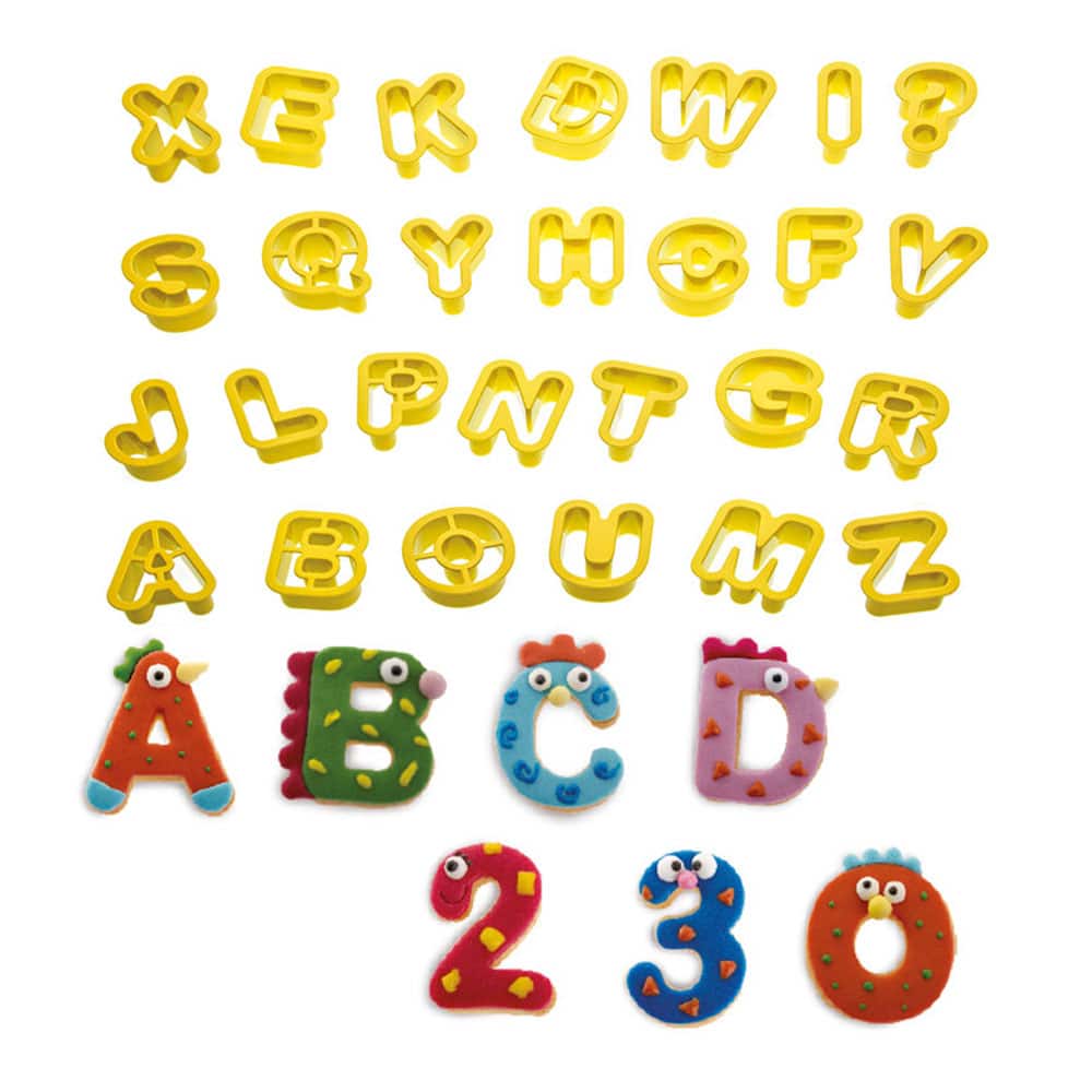 36 detailset plastist tähestiku- ja numbrivormi suhkrumassist ja martsipanist tordikaunistuste vormimiseks. Vormide suurus: 20 x 16 mm.