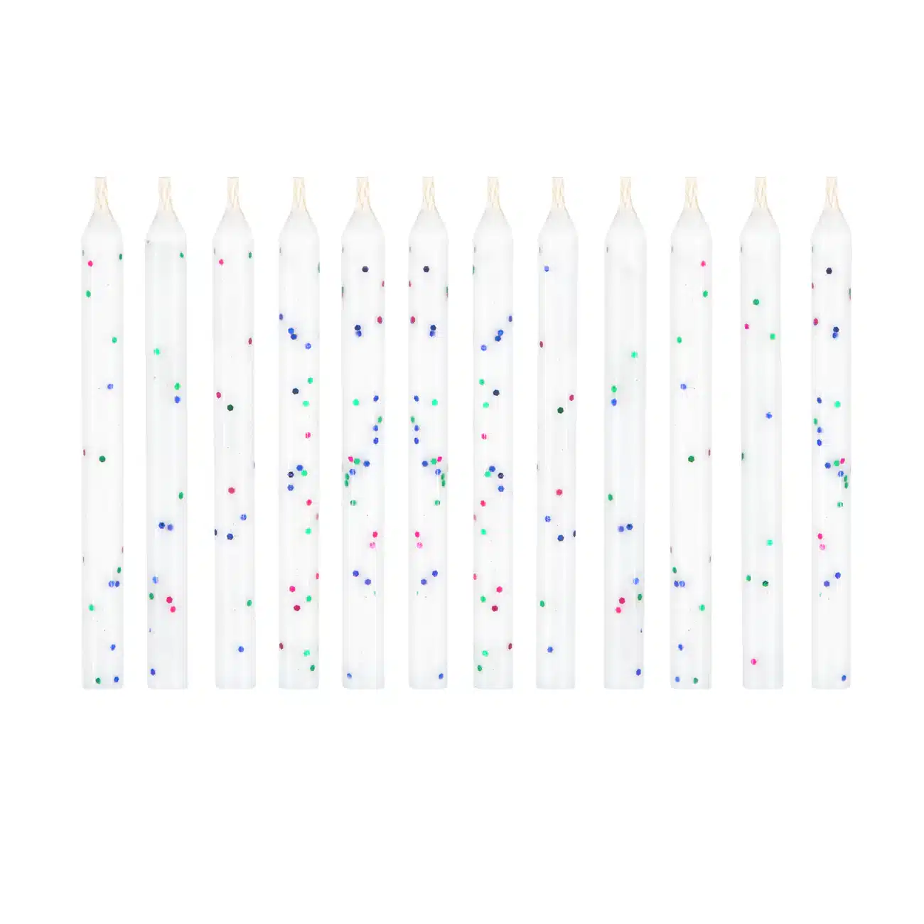 Uuestisüttivad valged glitter tordiküünlad, 12 tk